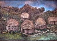パプア先住民の集落(画)。パプア先住民は清潔好きであり、住居ホナイの内外は清掃が行き届いている。