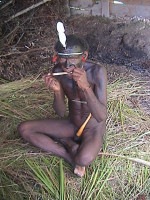笛を吹くパプア先住民の男性。今なお、寒い中裸で過ごす者は少なくない。